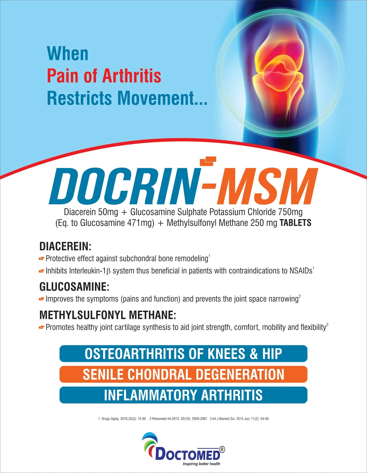 Diacerein IP 50mgGlucosamine Sulphate Potassium Chloride USP 750mgEq. to Glucosamine 471mgMethylsulfonyl Methane USP 250mg